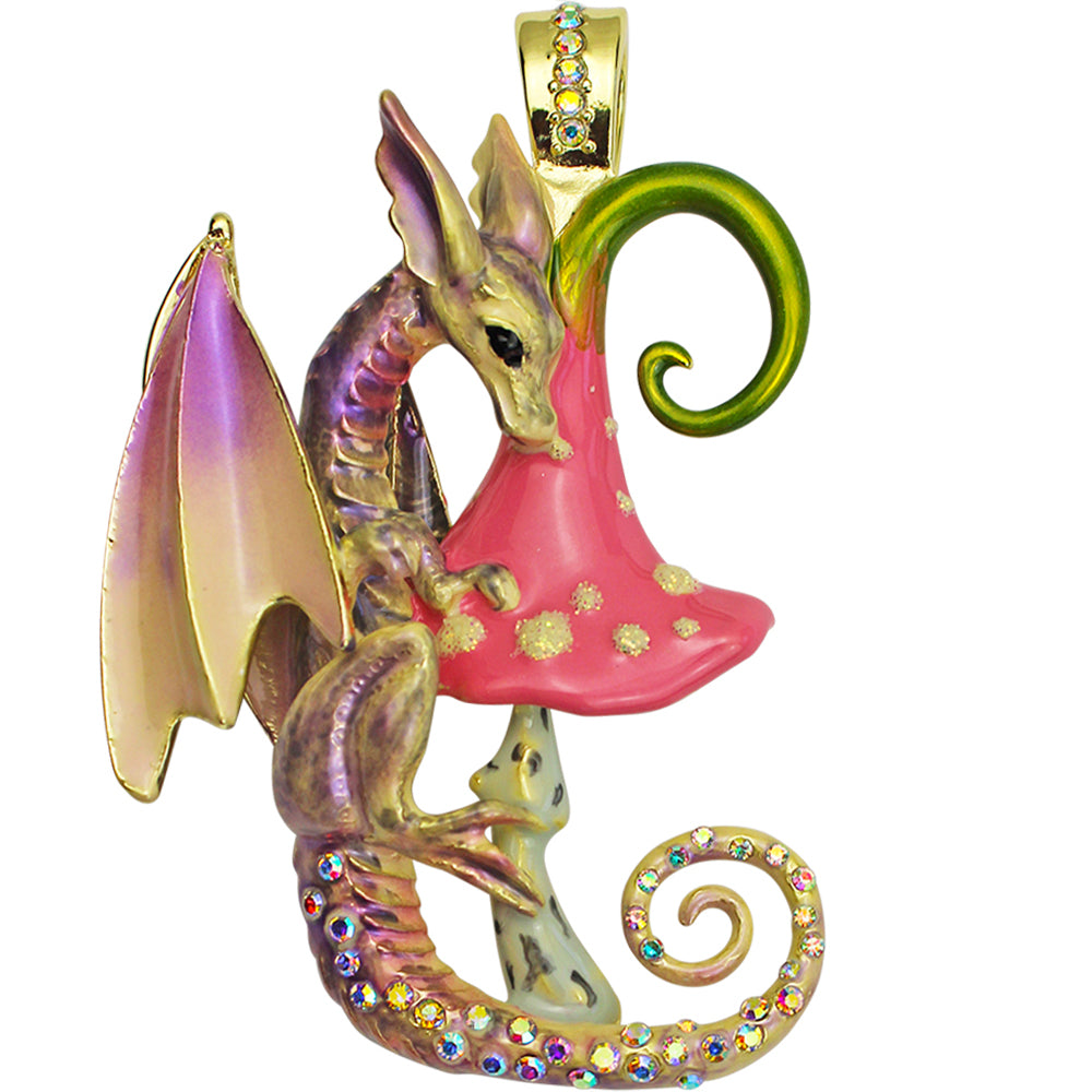 A sweet little dragon clings to a pink sparkling fairy mushroom on the Enchanted Forest Dragon Foldover Pendant.