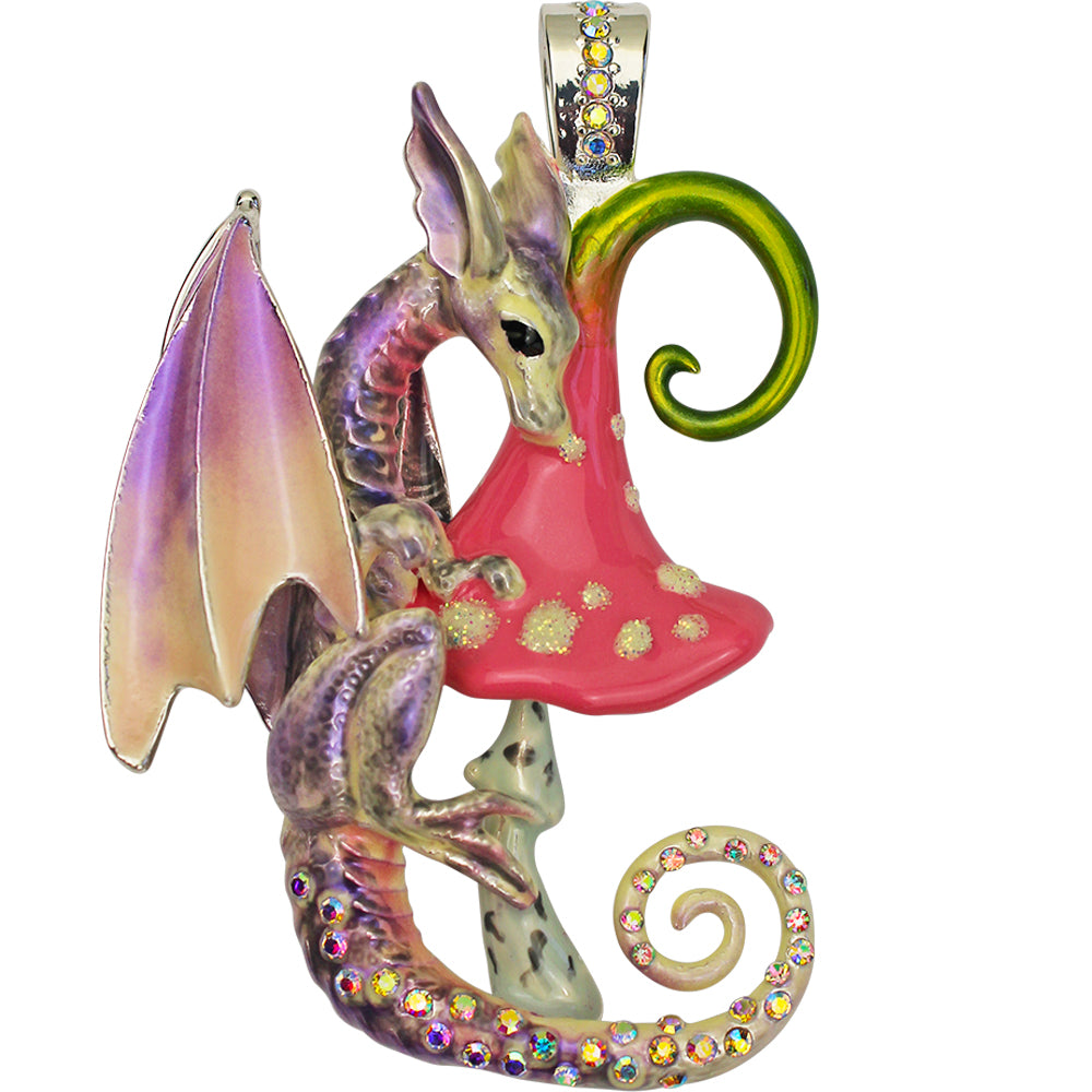 A sweet little dragon clings to a pink sparkling fairy mushroom on the Enchanted Forest Dragon Foldover Pendant.