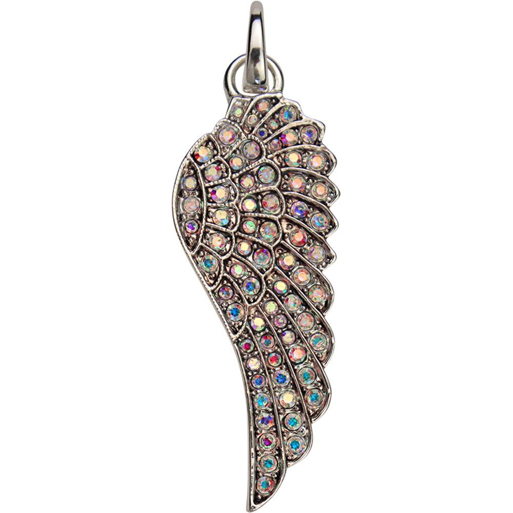 This open ring charm showcases a beautifully detailed angel wing, sparkling with radiant crystals that evoke a sense of peace and protection.
