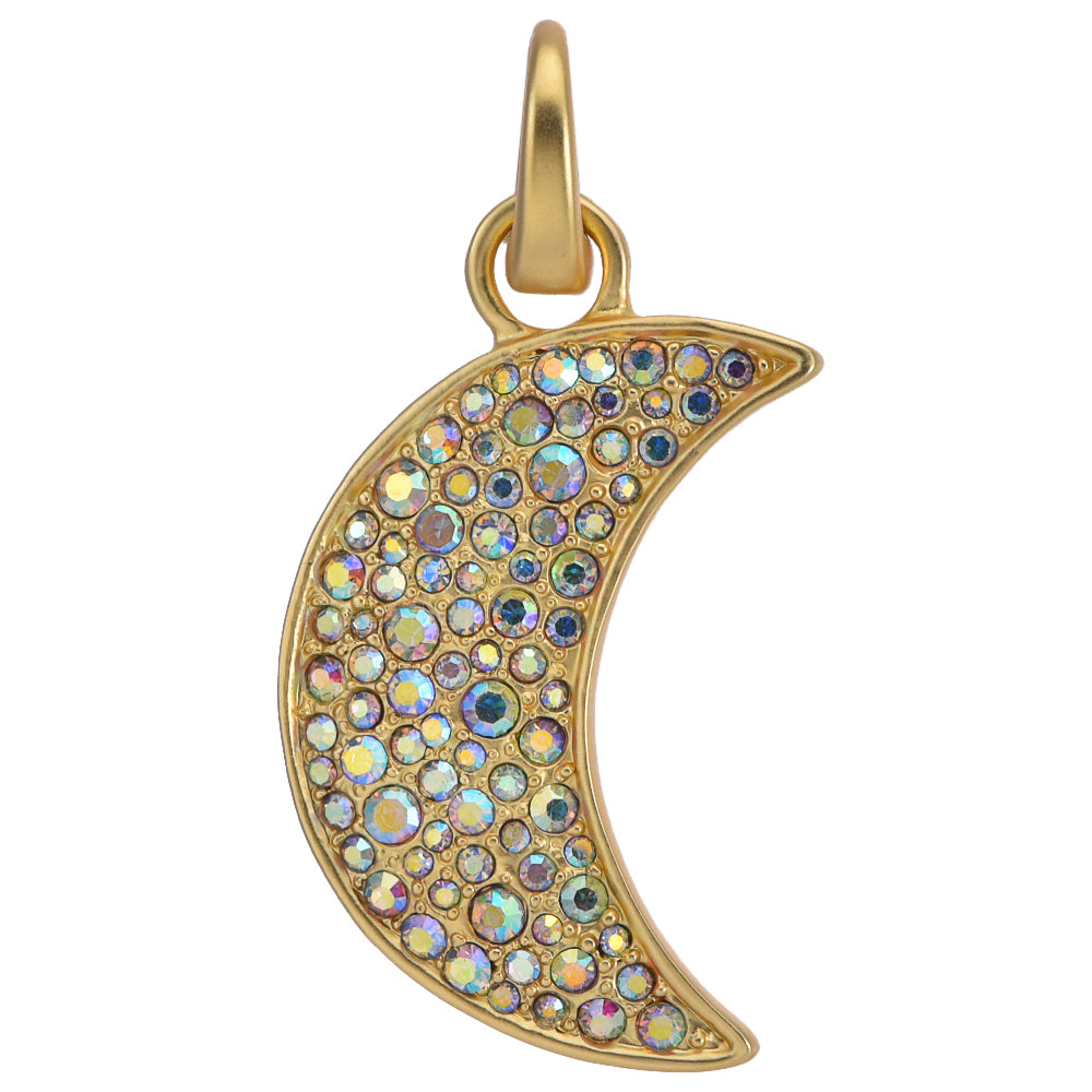 This open ring charm unveils a luminous crescent moon, its surface sparkling with faceted crystals of every size, capturing the textured beauty of the lunar landscape in crystal form.