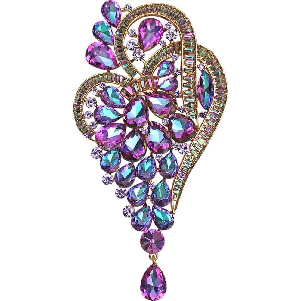 A regal array of faceted teardrop multicolored crystals crown this brooch, each jewel gleaming in splendid prismatic hues like treasures from a royal trove.