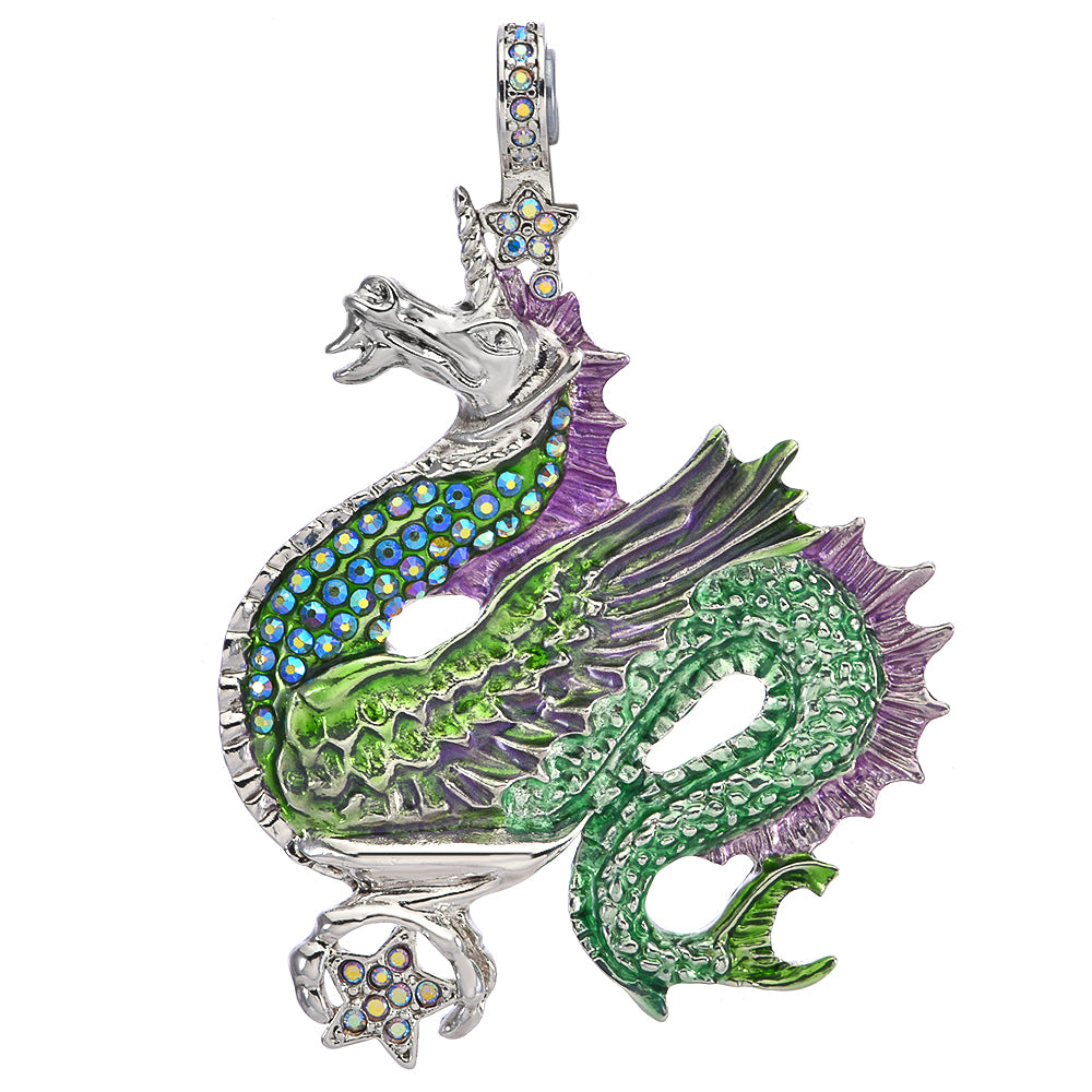 This magnetic enhancer features the Siren Sea Dragon, her serpentine form alive with faceted crystals and hand enameled sea-green and lavender hues.