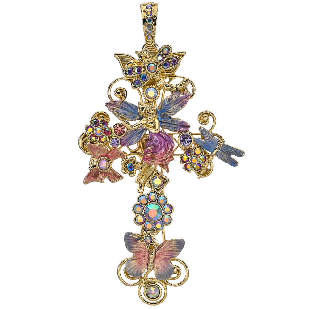 This fold over pendant unveils a cross sculpted from fairies, butterflies, and dragonflies cloaked in crystal shimmer, each one frozen mid-dance in a spell of aurora borealis.