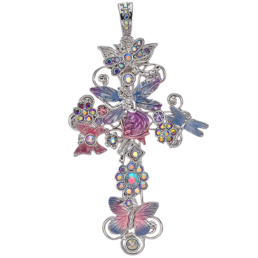 This fold over pendant unveils a cross sculpted from fairies, butterflies, and dragonflies cloaked in crystal shimmer, each one frozen mid-dance in a spell of aurora borealis.