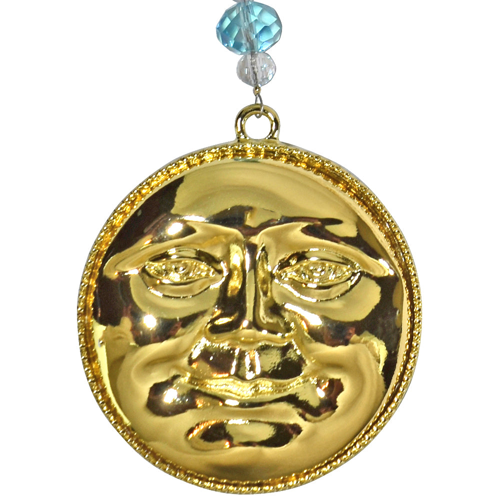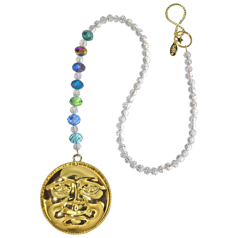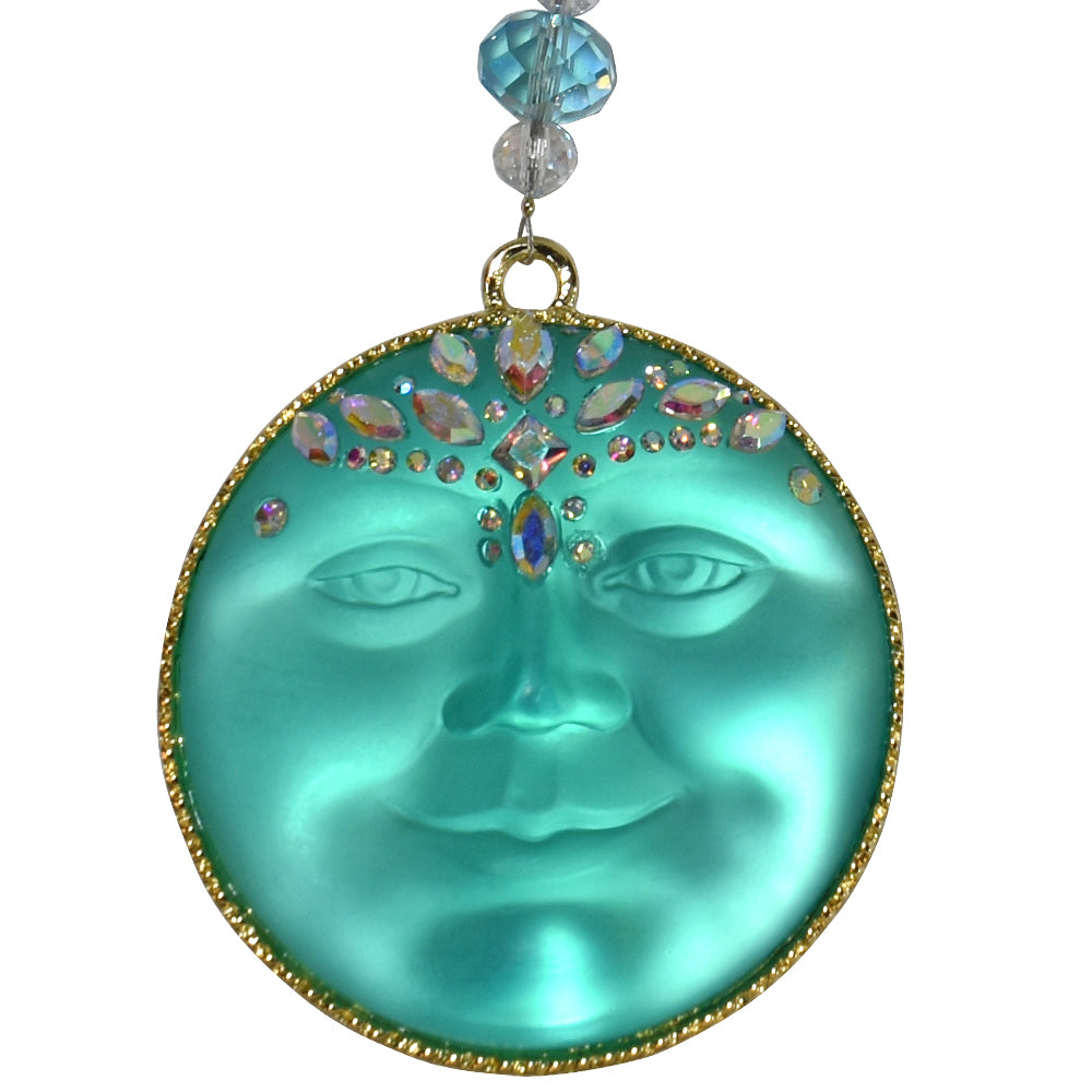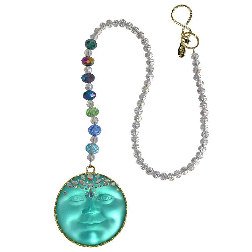 The large faceted rainbow beads are a beautiful accent to the vibrant aqua green color of the moon.