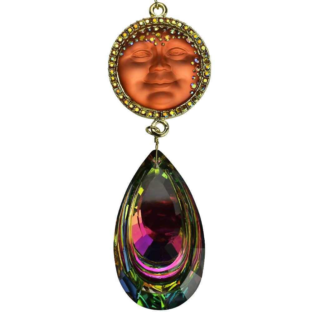 Swaying below the moon is a multi colored faceted teardrop crystal saturated with shades of fuchsia, green, sapphire, topaz and purple.