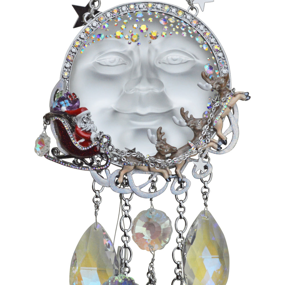 Cascading down the face of the moon are tiny sparkling crystals and for more moon shine a ring of faceted stones circle the moon.