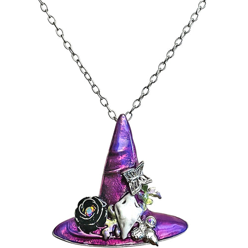 "One Of A Kind" Diva Purple Passion Witch Hat Pin Pendant with Chain Necklace (Silvertone)