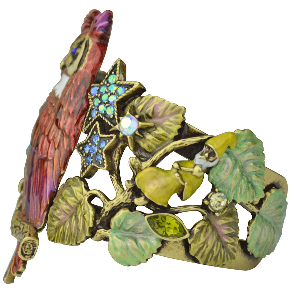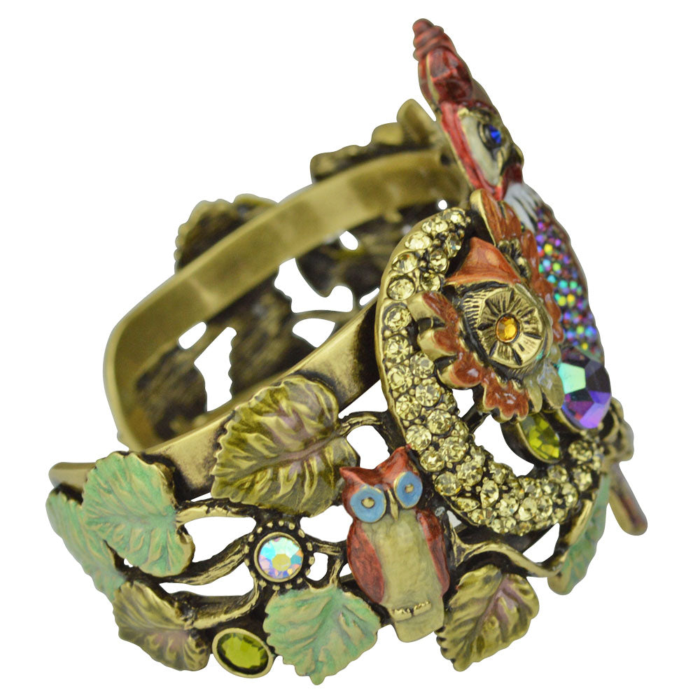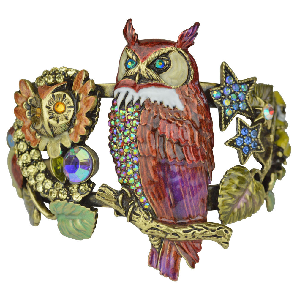 An all seeing and knowing Great Horned Owl is perched in the center of the Owl Of Wisdom Cuff Bracelet.