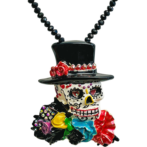 "One Of A Kind" Mr. Bones Sugar Skull Pin Pendant With Beaded Necklace (Goldtone)