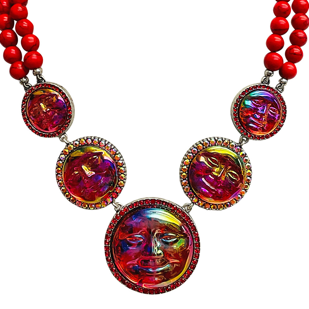 " One Of A Kind" Seaview Water Moon 5 Stone Beaded Necklace (Silvertone/Red)