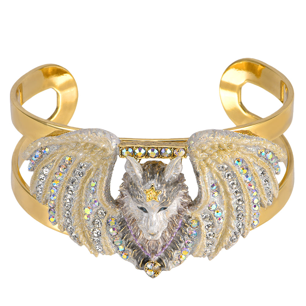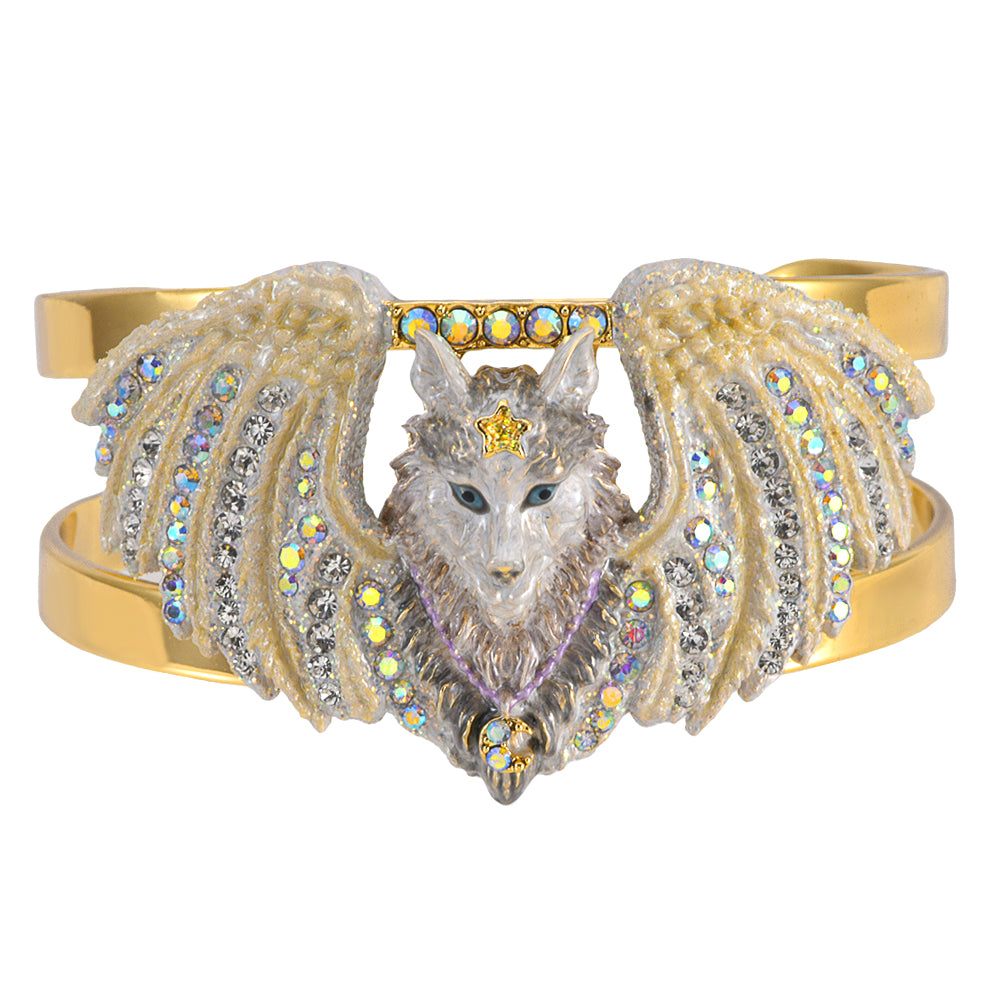 This cuff bracelet wraps the wrist in a tale of wild magic, where a hand-enameled wolf peers proudly, its crystal-adorned wings glinting like starlight caught in frost.