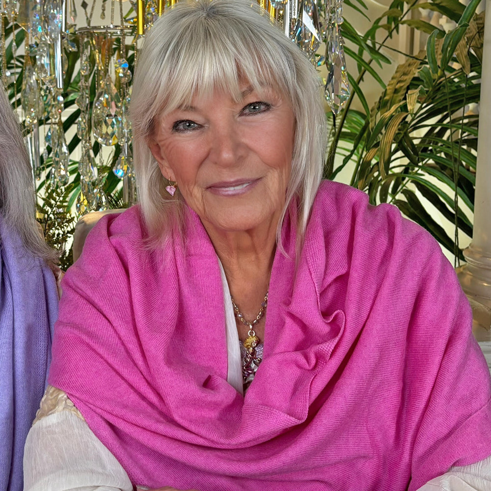 Like a dream spun from the clouds, this cashmere shawl drifts like a whisp of twilight caught in a veil of pastel mist.