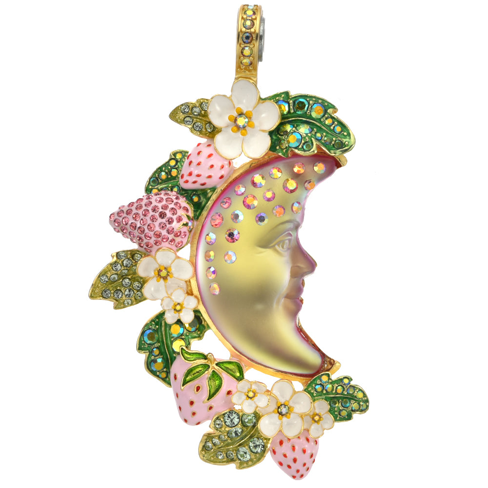 A crescent moonstone softly glows at the heart of this magnetic enhancer, its surface sprinkled with twinkling faceted crystals, encompassed by a garden of shimmering strawberries.