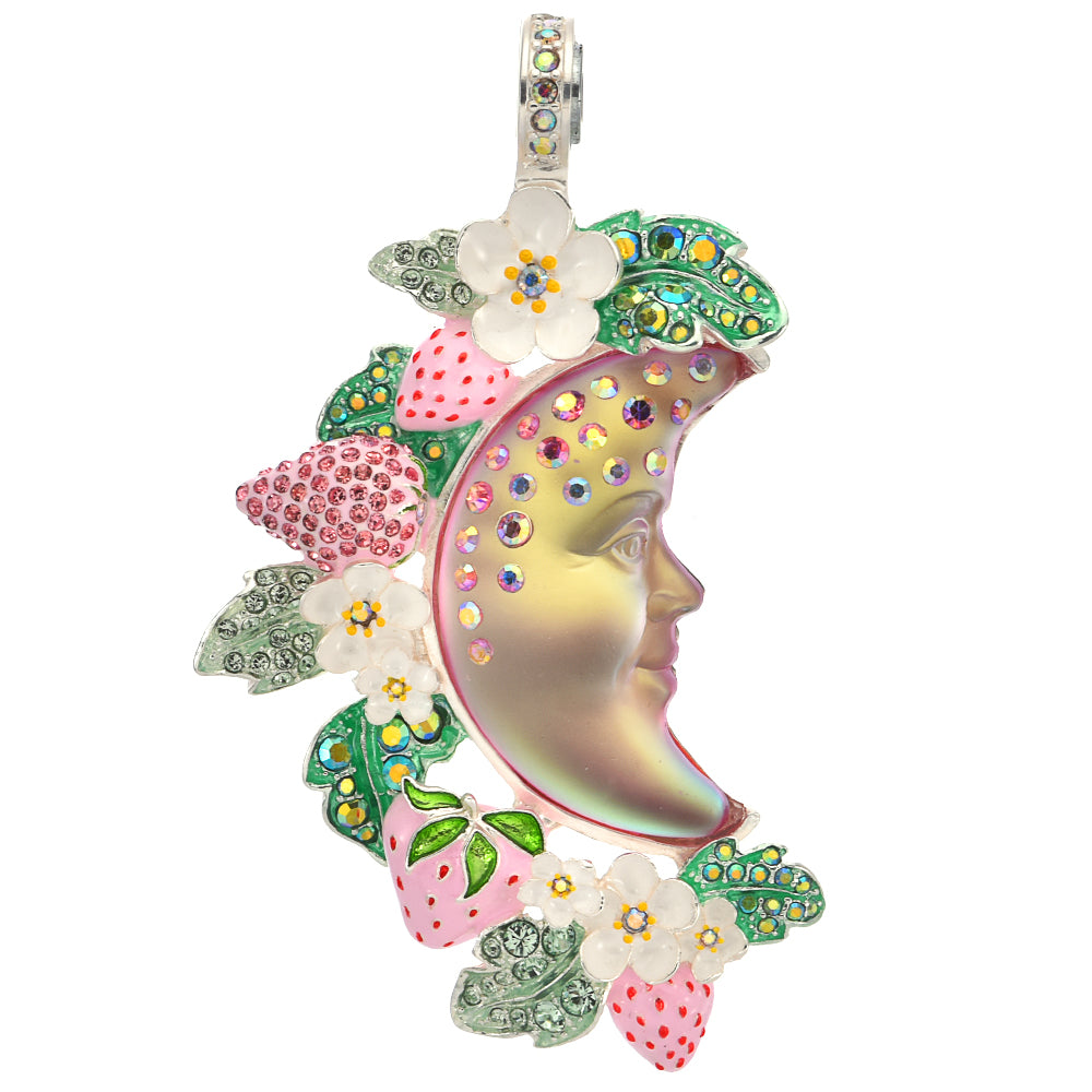 A crescent moonstone softly glows at the heart of this magnetic enhancer, its surface sprinkled with twinkling faceted crystals, encompassed by a garden of shimmering strawberries.