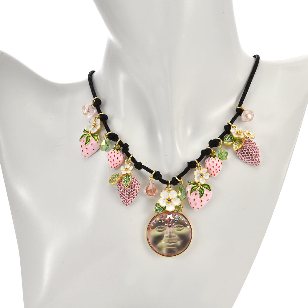 A crystal-kissed Seaview Moonstone blossoms at the heart of this necklace, surrounded by a garden of sweet strawberries that dazzle with every gentle movement.