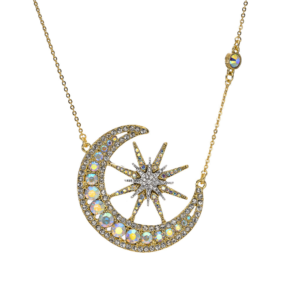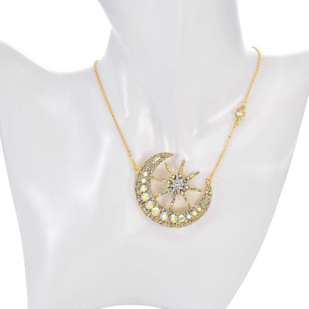 This celestial necklace unveils a crescent moon adorned with faceted aurora borealis crystals that glimmer like frozen moonlight.