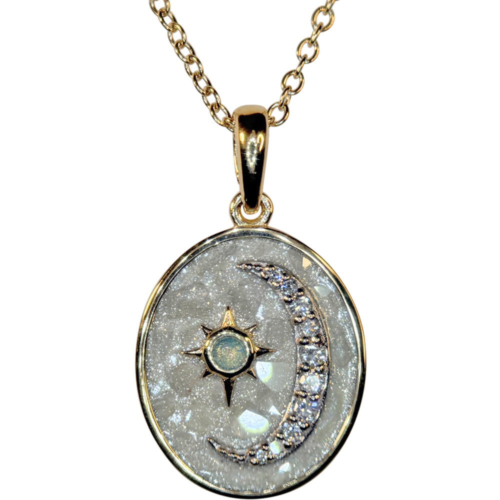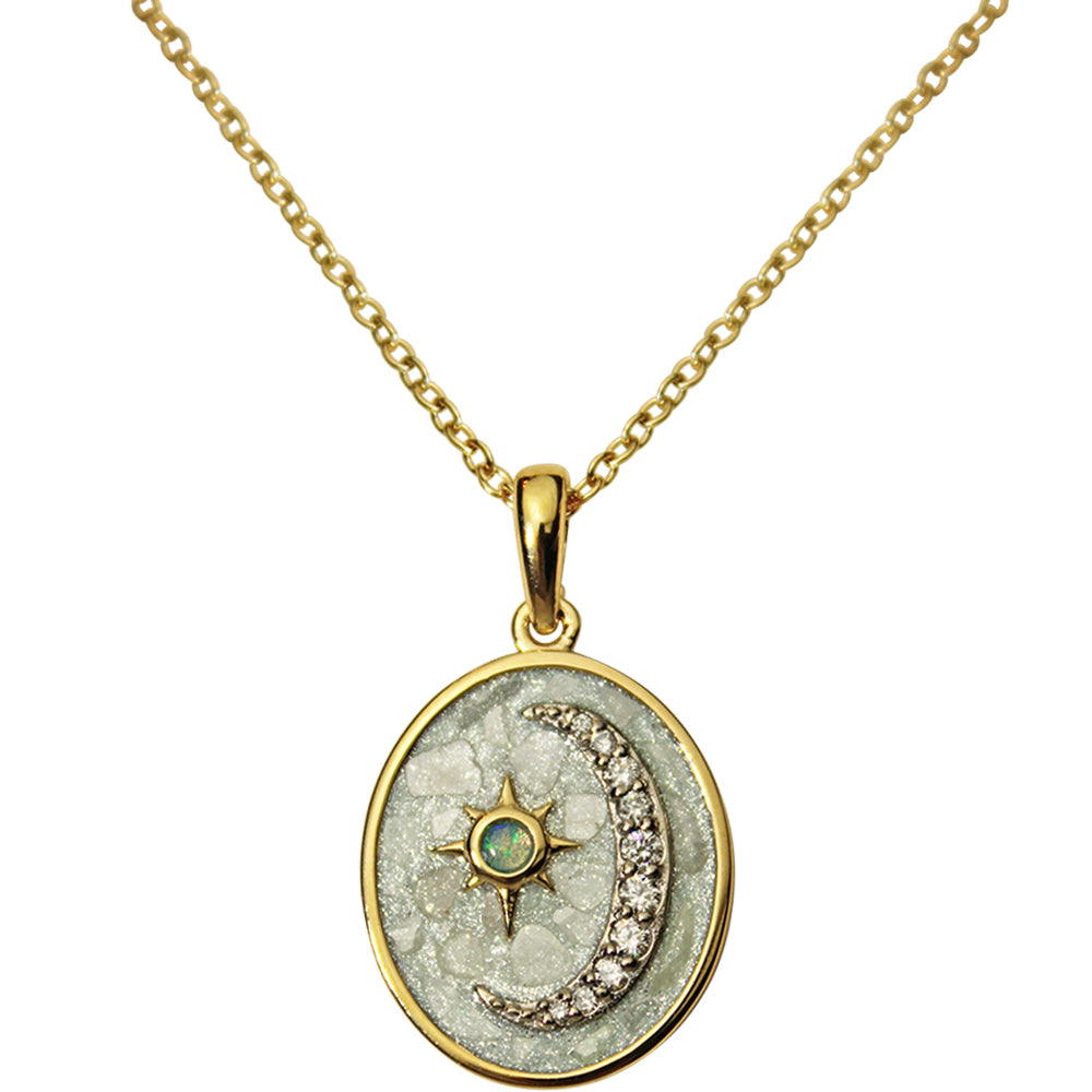 The Love Never Dies necklace features an oval charm with a crescent moon paved with 10 brilliant cut faceted lab diamonds and a star accented with a natural opal.