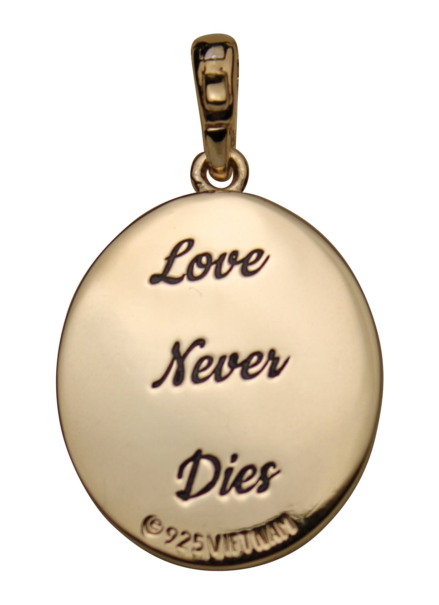 The pendant is engraved on the back with the beautiful message "Love Never Dies”