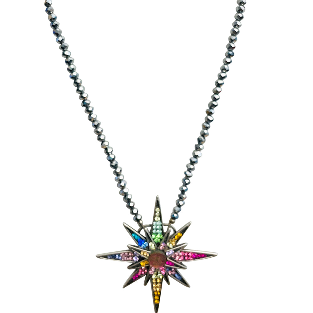 "One Of A Kind" Glass Seaview Moon Super Star Beaded Slide Necklace (Silver Ox)