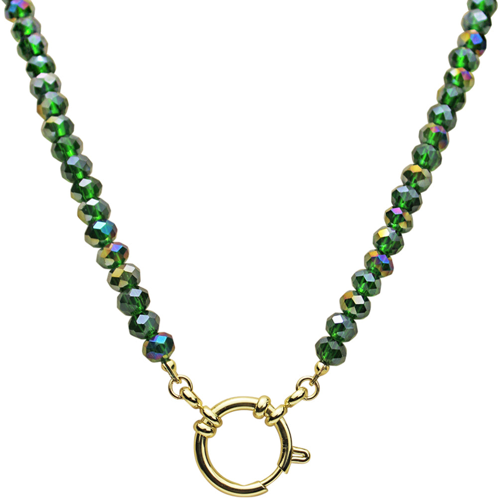 Crystalized 6mm Beaded Sailor Clasp 18" Charm Necklace (Goldtone/Emerald AB)