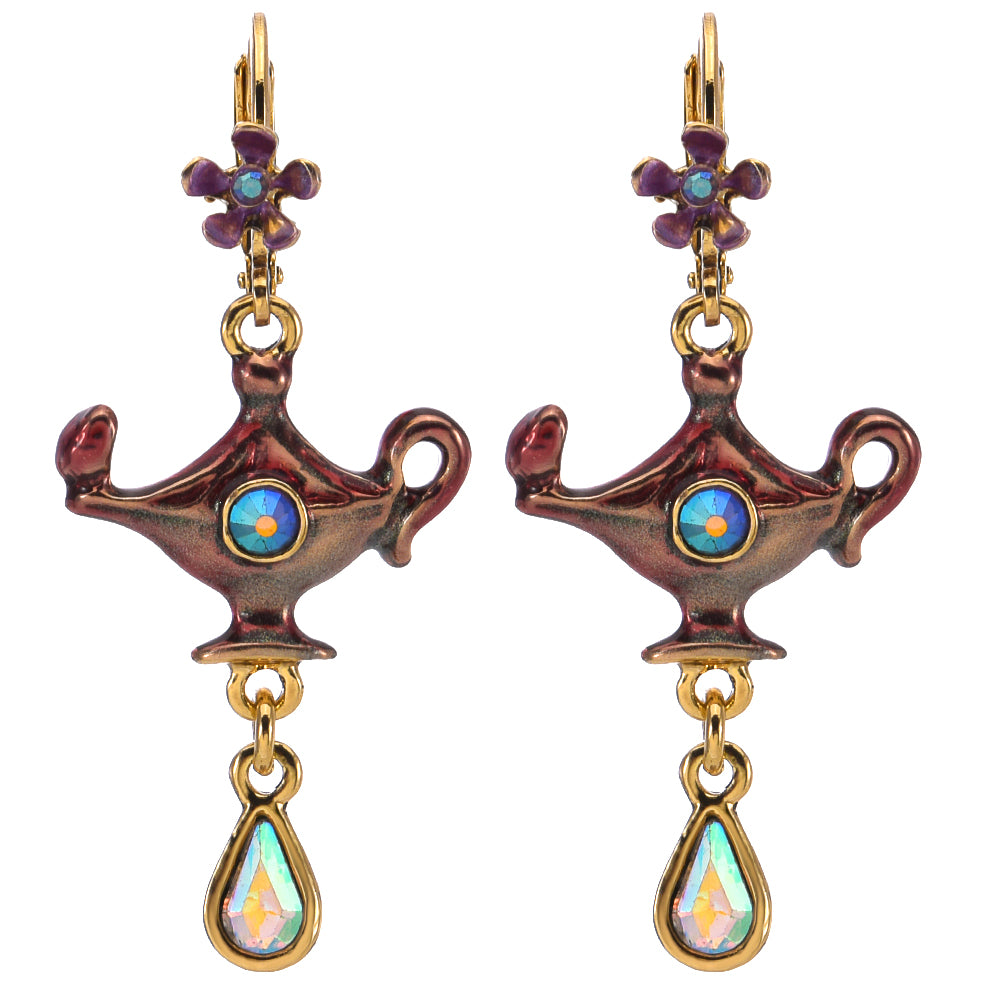 These leverback earrings dazzle with a pair of enchanted genie lamps, each crowned with a faceted crystal that glimmers like a captured wish.