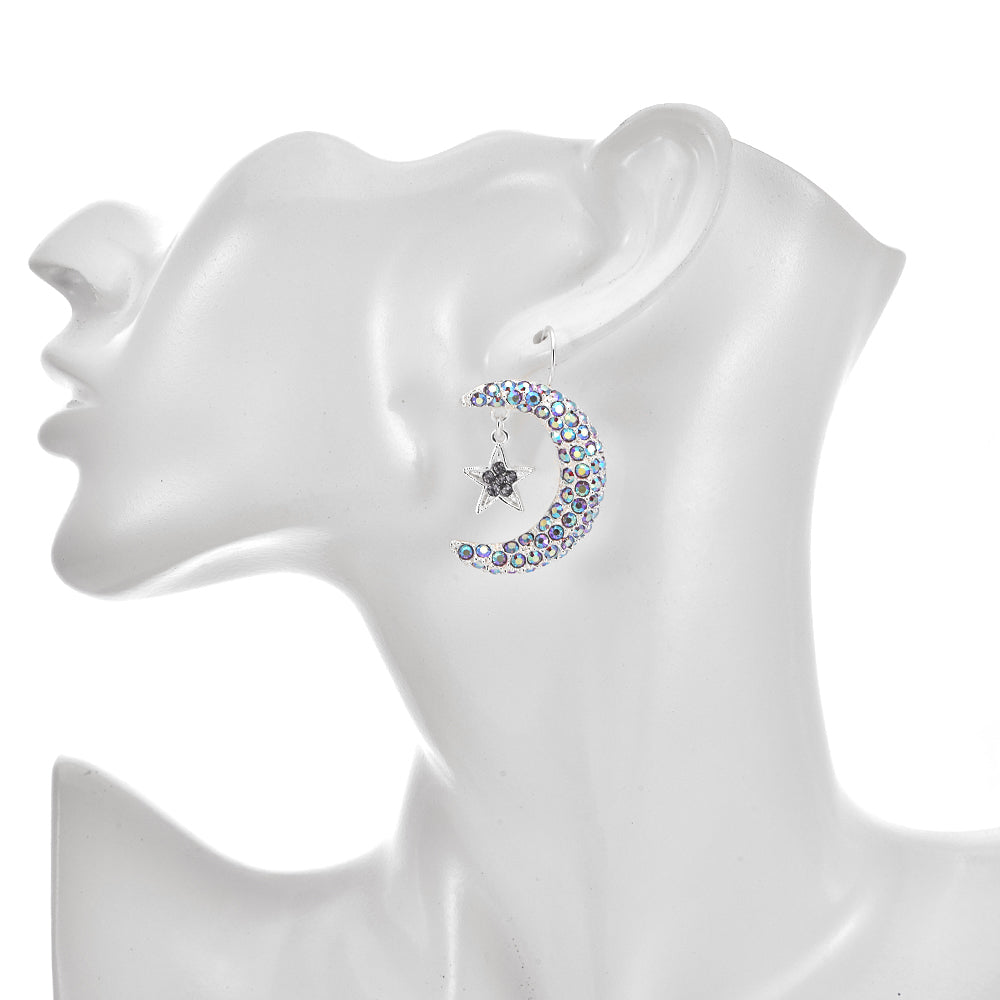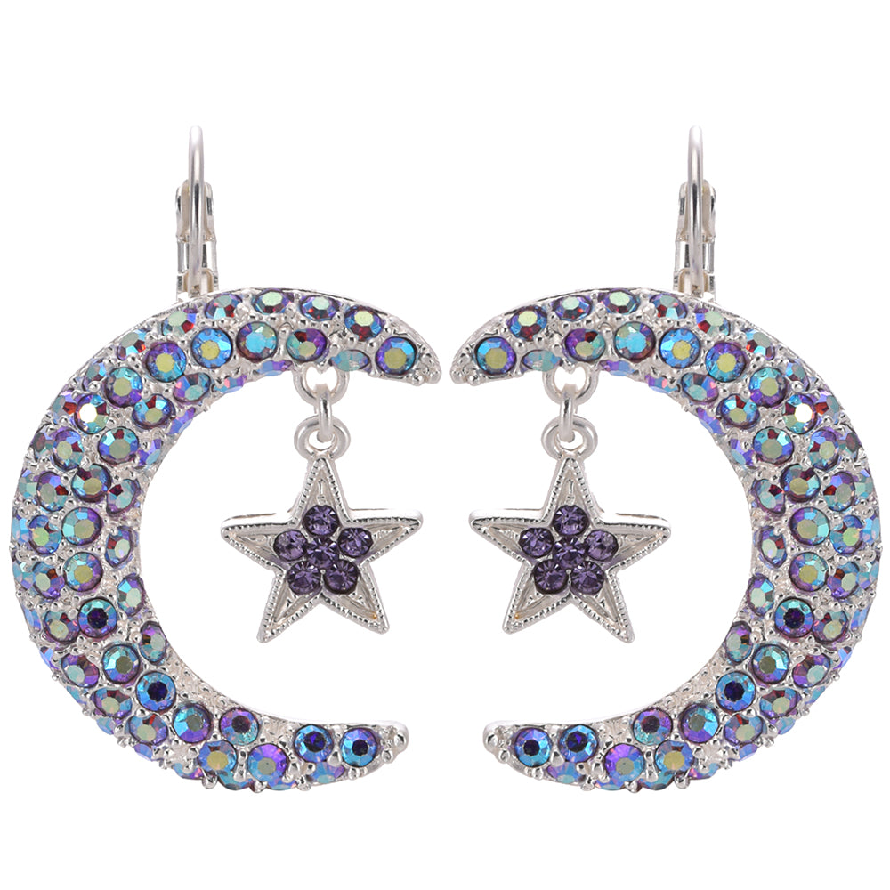 The Stella Luna Leverback Earrings twinkle with their crescent moons encrusted with shimmering crystals, each radiating a luminous, cosmic brilliance. From the upper arch of each moon, a moonlit star glows like a treasure plucked from the night sky.